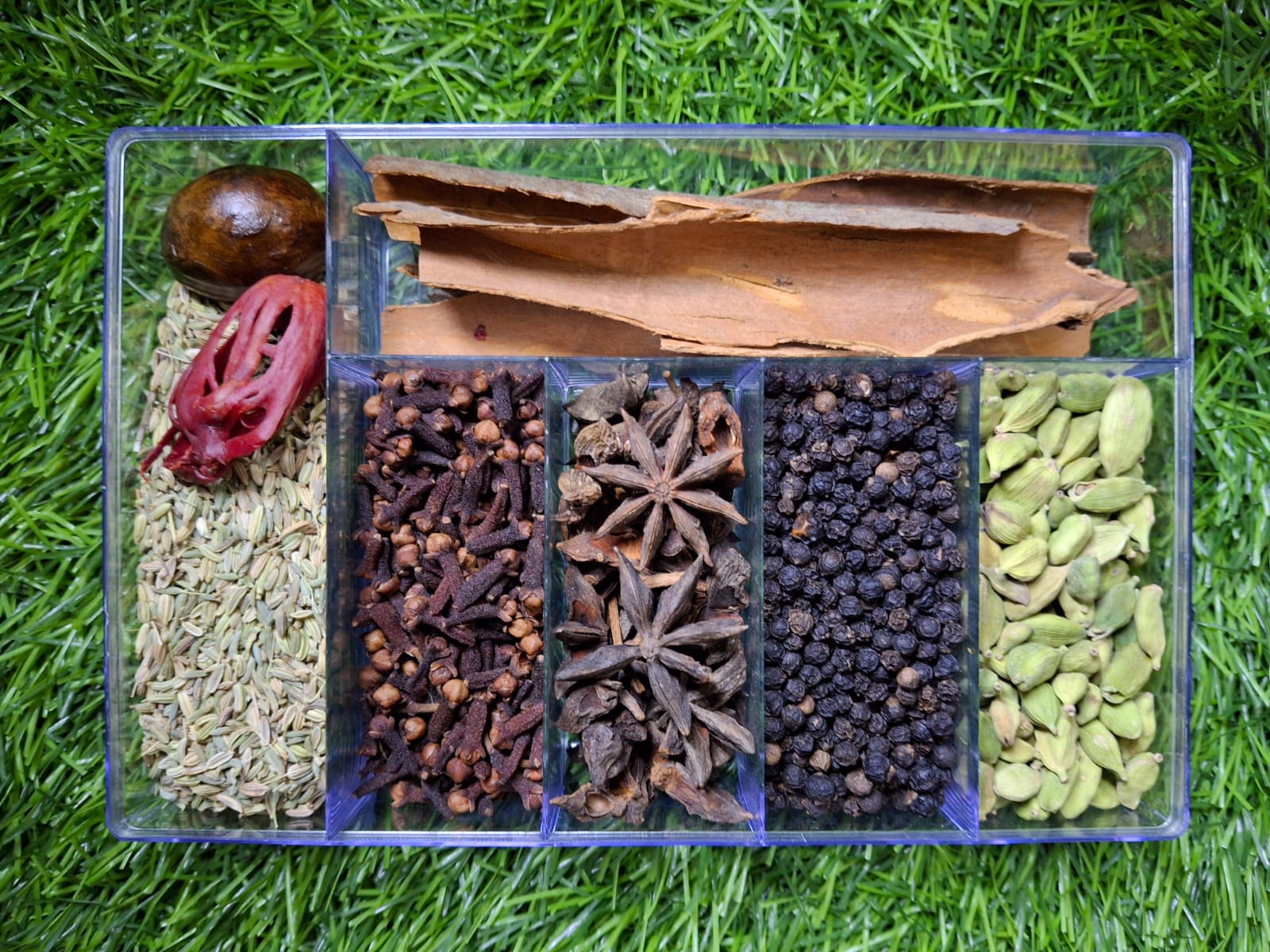 3. **Cardamom**: Nestled in its own jar, the green cardamom pods are plump and fragrant. The pods are intact, protecting the tiny black seeds inside that hold the true essence of cardamom's sweet and citrusy flavor.